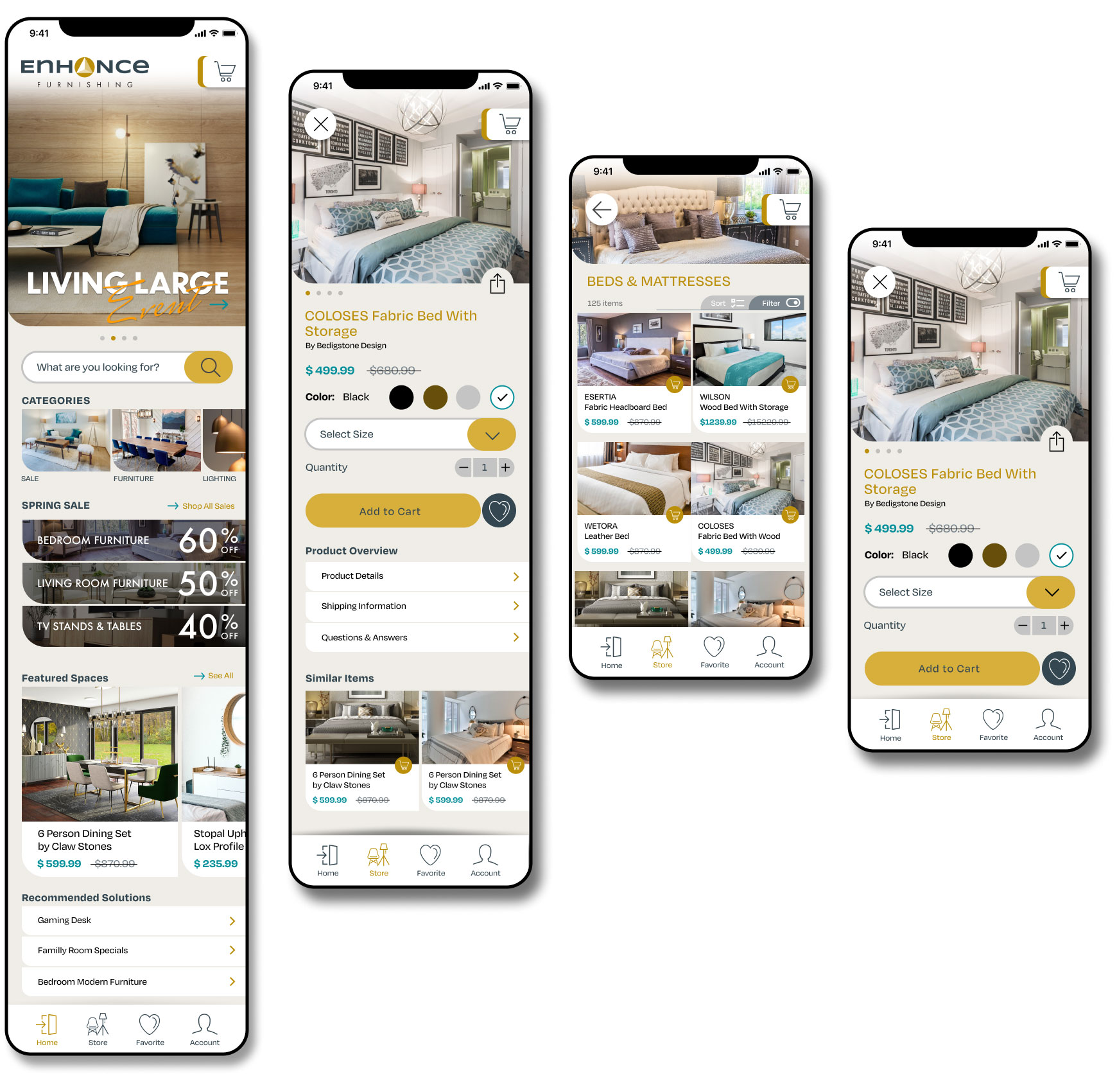From the first screen, I wanted to welcome the user with four rotating frames with the option to skip. These frames promote featured products or discounted offers. Next, I invite the user to enter the beautiful world of Enhance Furnishing from the first screen. Through excellent products and modern spaces, you can feel the atmosphere of serenity proposed.