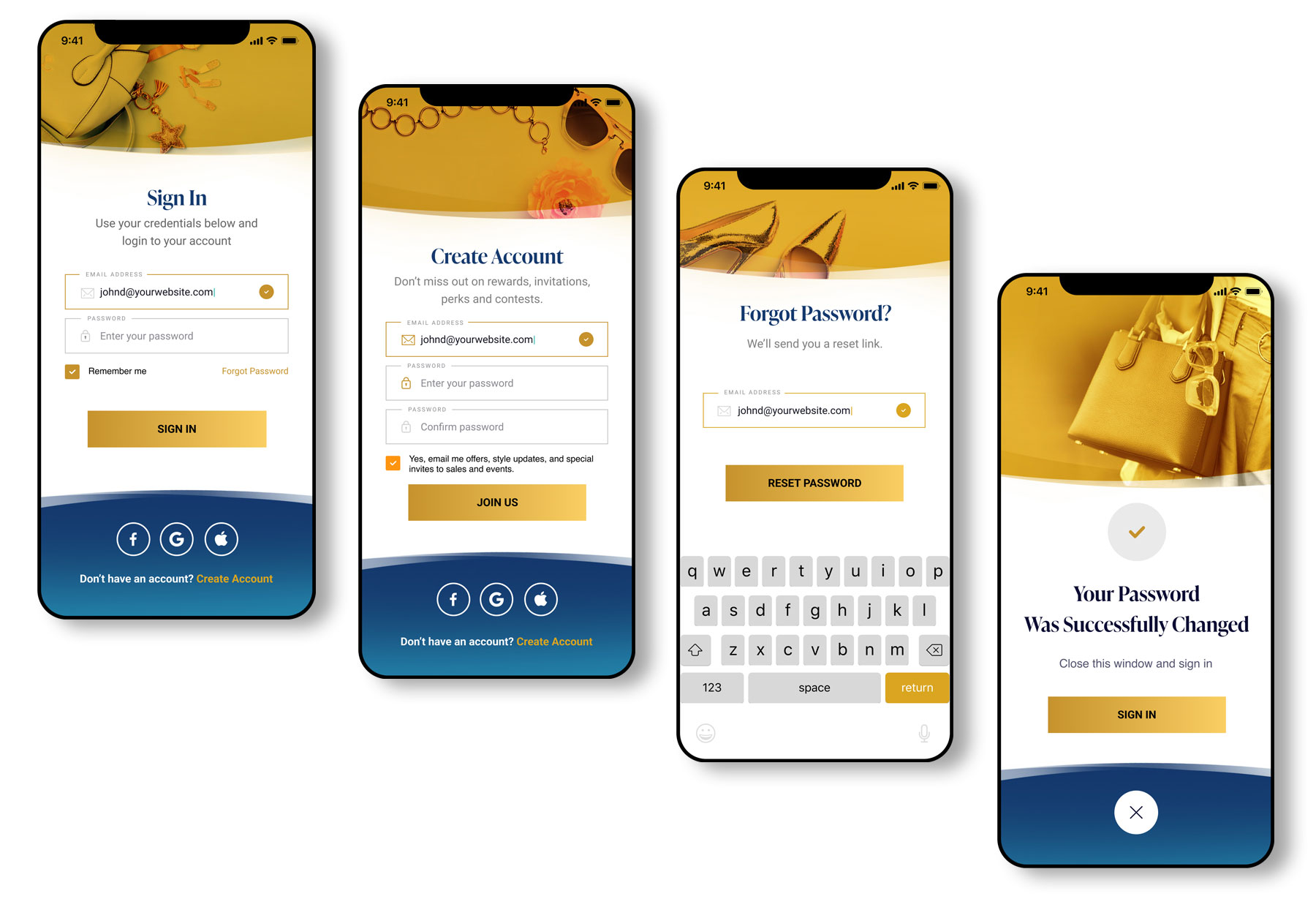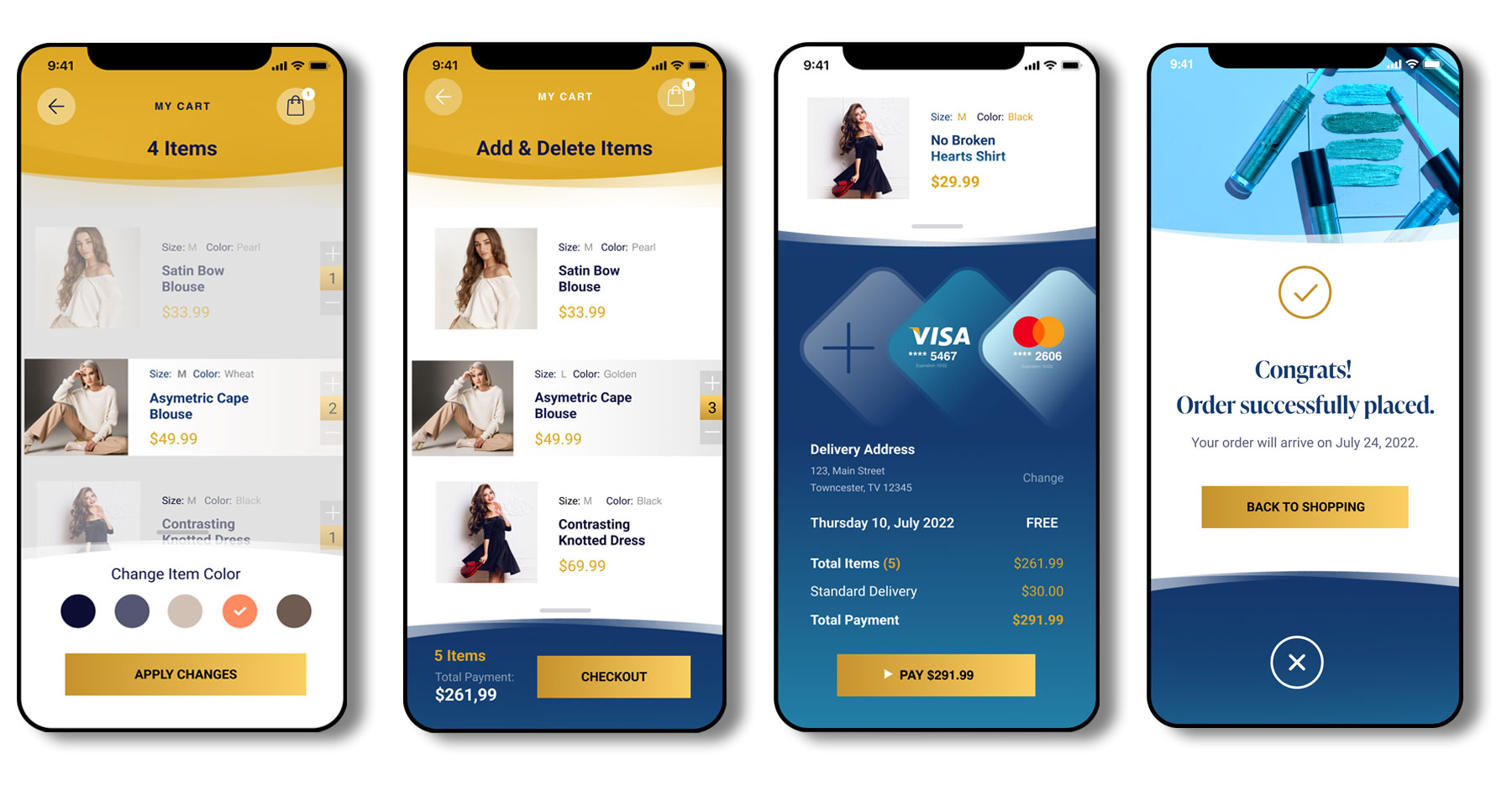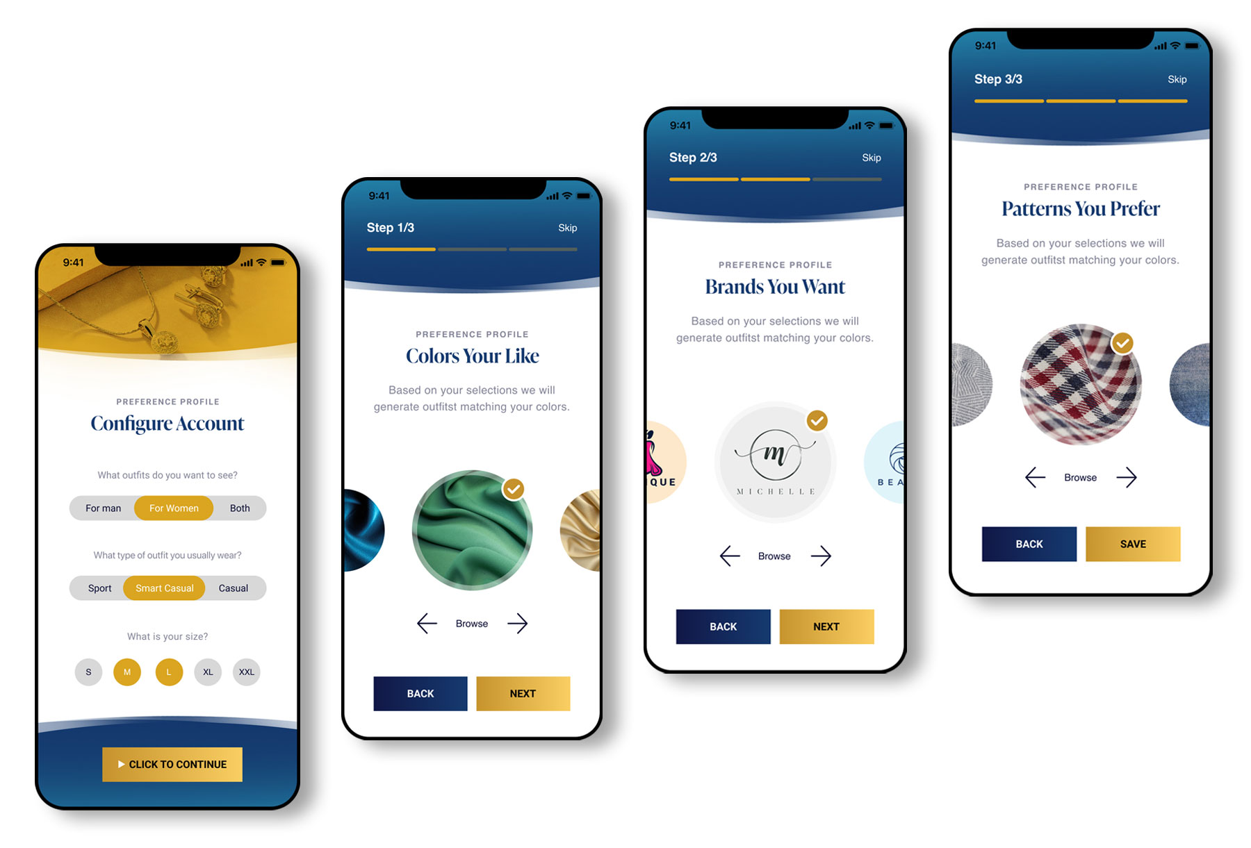 Based on research, I decided on two primary colours – Gold and Blue – to portray to the prior users – Men and Women. Additional colours are coming to sustain and accent the direct colour approach. The picked fonts cover the two main directions – Serif and Sans Serif. As a designer, I feel that Serif fonts are more feminine, and Sans Serif fonts are more masculine. This kind of approach puts the two directions in one is portrayed in the logo, making the app a good platform for inclusivity and individuality.