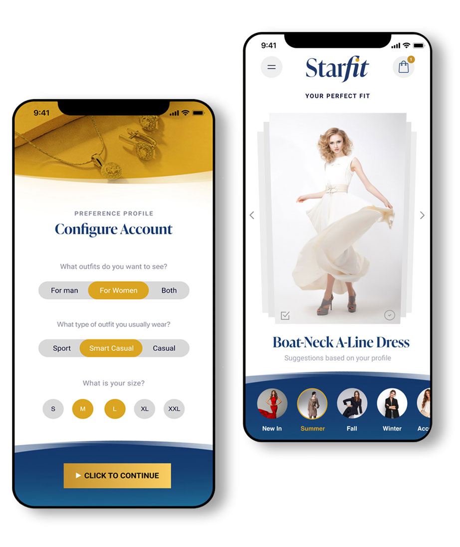 Starfit wants users to have an authentic and reliable experience, clear and intuitive, based on a deep understanding of the user’s needs, preferences and market availability. Starfit is not just a regular app; it is an intelligent app based on artificial intelligence (AI) that will learn your style and what you like, be up-to-date with the trends and deliver unique solutions tailored for you.