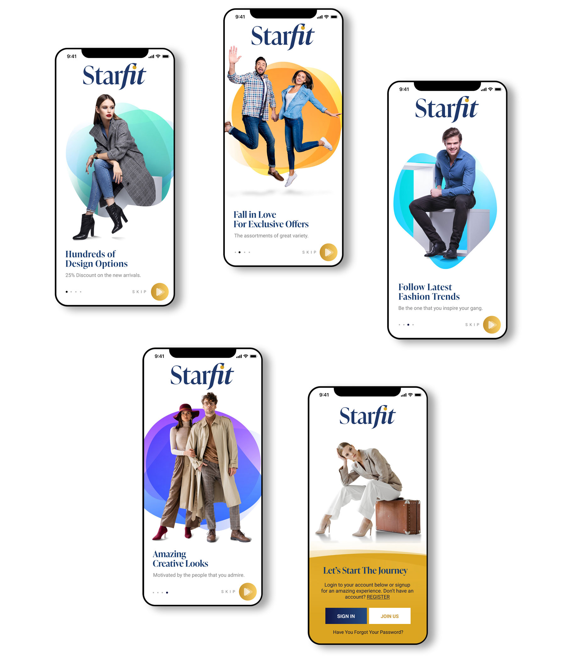 When the user launches the Starfit app, he can see the four Welcome screens, followed by the Onboarding screen. The four welcome screens rotate various offers and discounts that can take the user to these featured products. An important feature I saw necessary is the skip button in case the user is not interested in these offers.